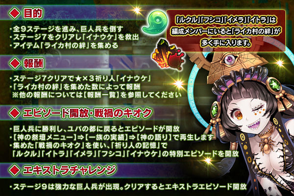 | E-9 | 蘇った緑の巨人兵(EXTRA) | ウル(水)x3000,4000 | ウル(火)x3000,4000 | ウル(水)x4000,6000 | 巨人兵(風属性) HP120000 待機時間なし 攻撃・防御 共にとても高い。EXTRAだけあってかなり強い 倒した体数でイベント限定の一族の実績に報酬がある(下記項目を参照) | |